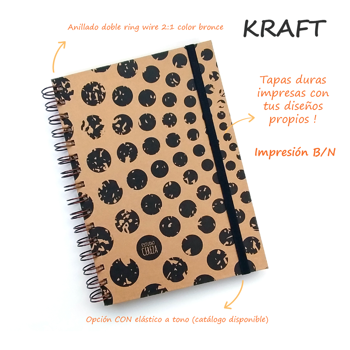 - Tapa y contratapa: impresas a todo color en papel Kraft de 90 g, sin laminar y montadas sobre cartón de 2 mm. La impresión de la tapa y contratapa está siempre incluida. Sin límite de diseños.