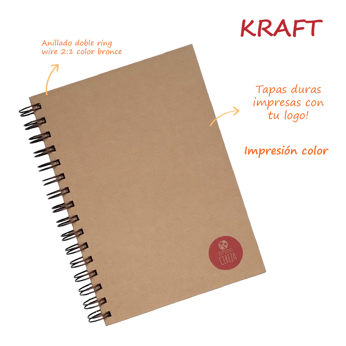 - Tapa y contratapa: impresas a todo color en papel Kraft de 90 g, sin laminar y montadas sobre cartón de 2 mm. La impresión de la tapa y contratapa está siempre incluida. Sin límite de diseños.