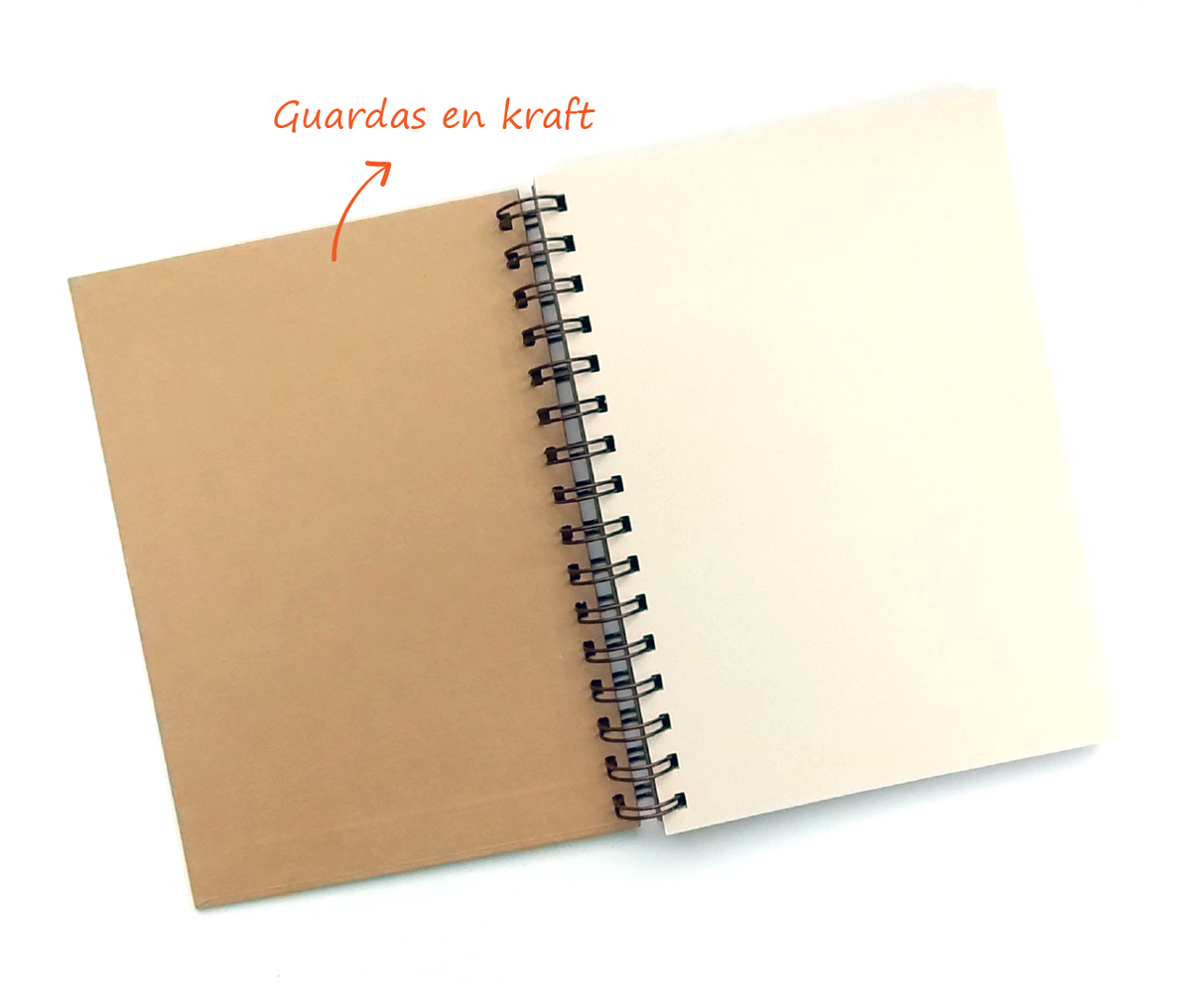 - Tapa y contratapa: en papel Kraft de 90 g sin impresión, sin laminar y montadas sobre cartón de 2 mm.