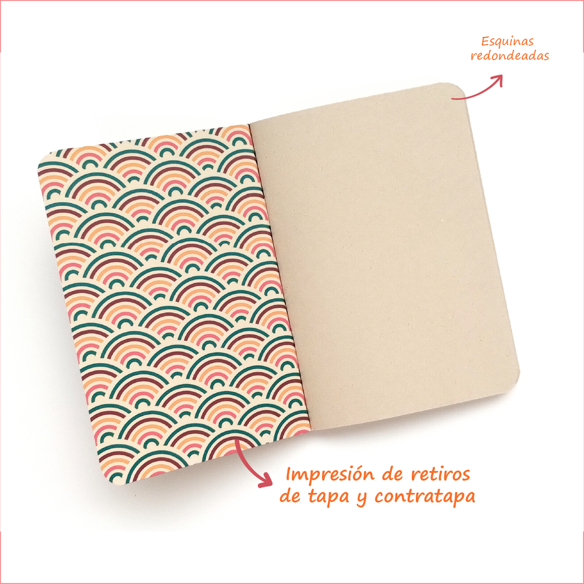 - Interior: 80 hojas (160 páginas/carillas) en papel ecológico NAT de 75 g, obra común de 75 g o ahuesado de 80 g. Podés elegir entre hojas lisas, rayadas, cuadriculadas, punteadas, pentagramadas o logo en pie de página.