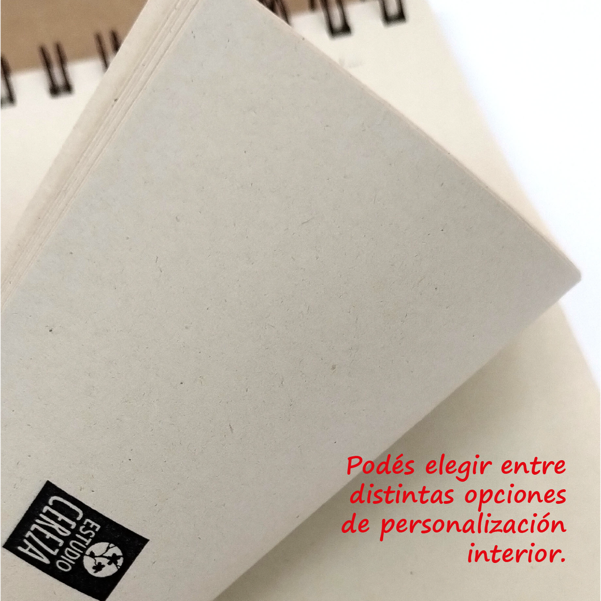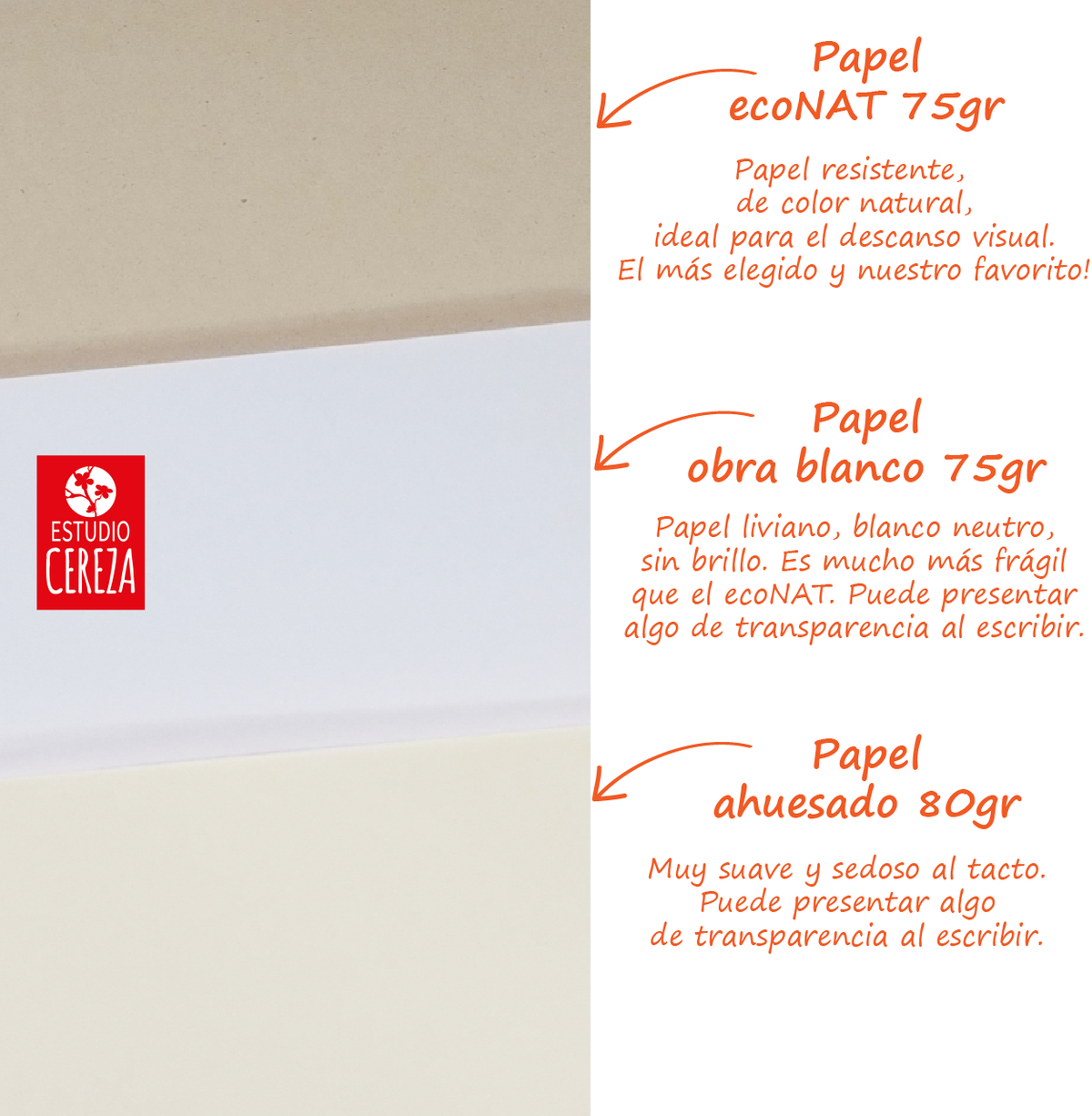- Interior: 80 hojas (160 páginas/carillas) en papel ecológico NAT de 75 g, obra común de 75 g o ahuesado de 80 g. Podés elegir entre hojas lisas, rayadas, cuadriculadas, punteadas, pentagramadas o logo en pie de página.