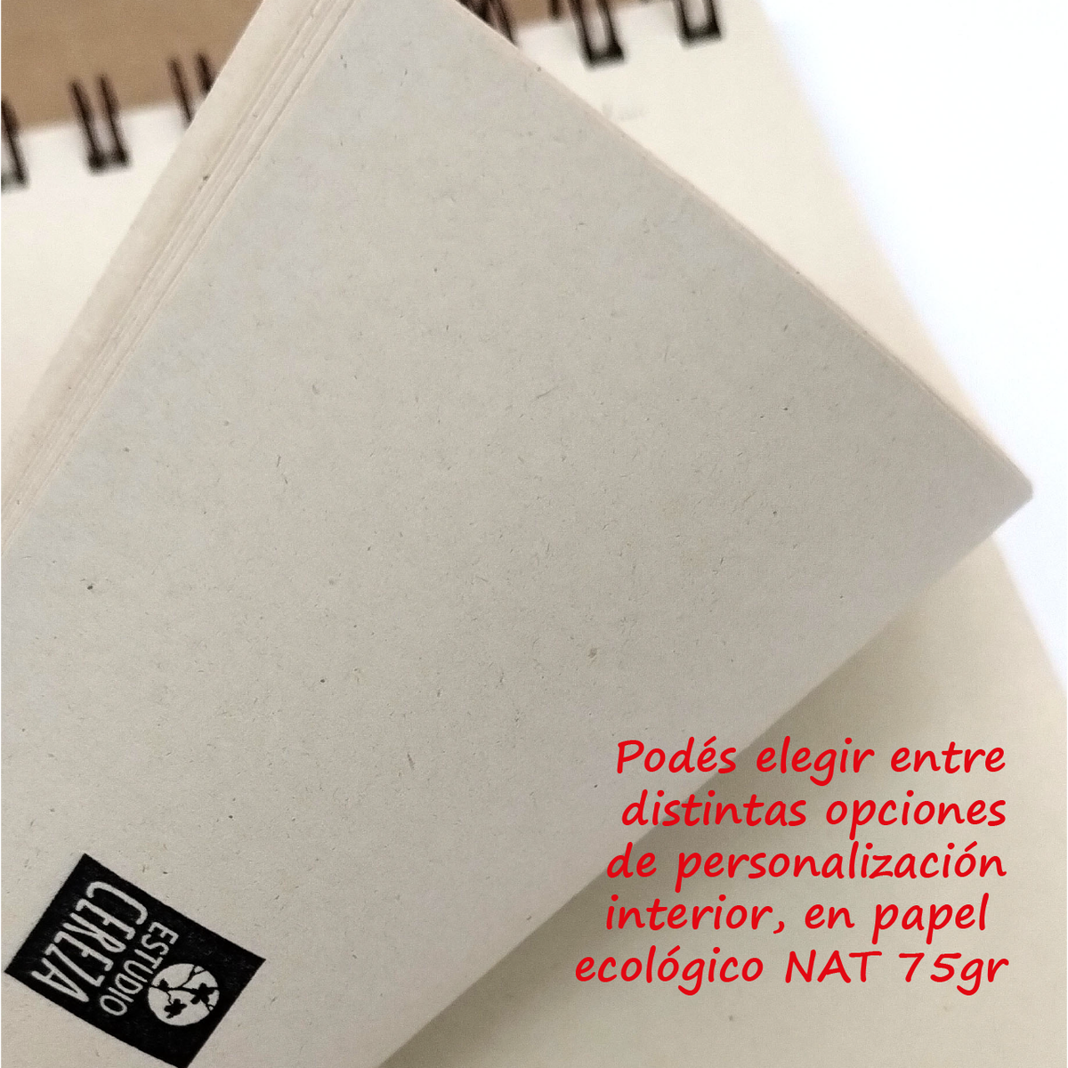 - Interior: 80 hojas (160 páginas/carillas) en papel ecológico NAT de 75 g. Podés elegir entre hojas lisas, rayadas, cuadriculadas, punteadas, pentagramadas o logo en pie de página.