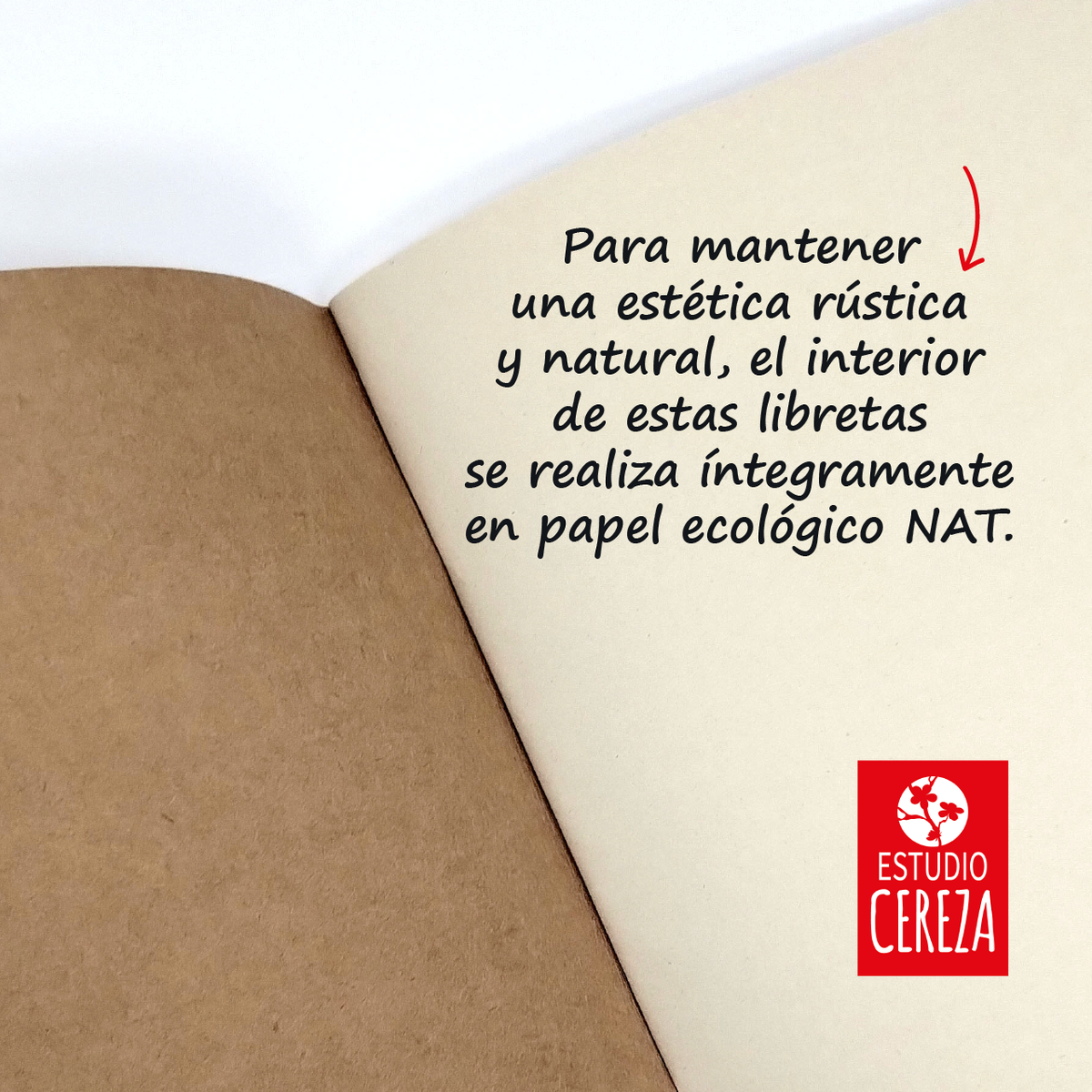 - Interior: 80 hojas (160 páginas/carillas) en papel ecológico NAT de 75 g. Podés elegir entre hojas lisas, rayadas, cuadriculadas, punteadas, pentagramadas o logo en pie de página.